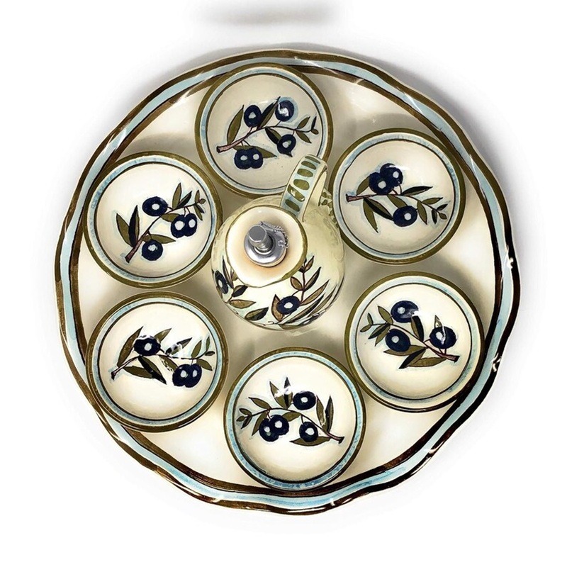 Hand-painted Mediterranean olive-themed ceramic oil dispenser set with 5 bowls and scalloped serving tray