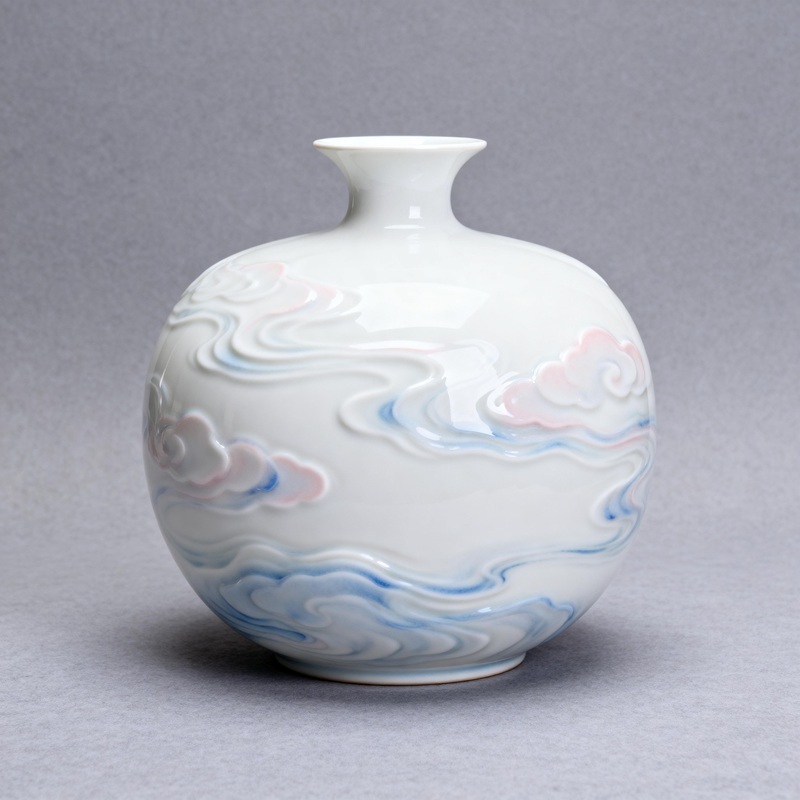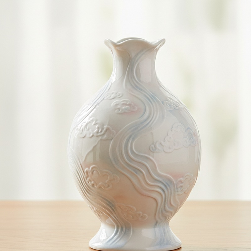 Imagine a vase that carries the elegance of traditional Chinese art: its smooth high-temperature porcelain surface glows with soft blue-pink gradient glaze, while hand-embossed cloud and lotus motifs add tactile, poetic texture. This is our Handcrafted Cloud-Patterned Porcelain Vase