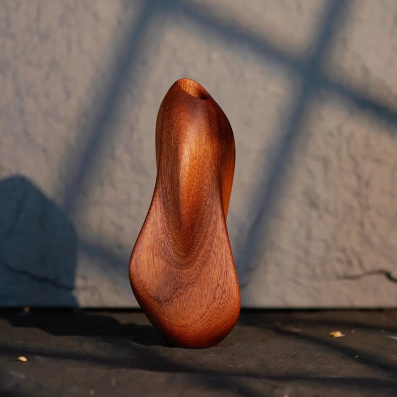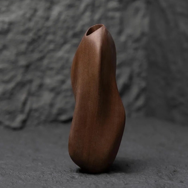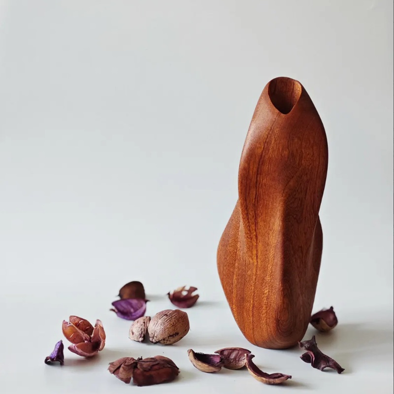El jarrón de madera está elaborado con madera de nogal rojo, mostrando una textura natural, mientras que parte del jarrón adopta un acabado de pintura negra para crear un efecto de contraste de color, infundiendo vitalidad natural y atmósfera artística al espacio.