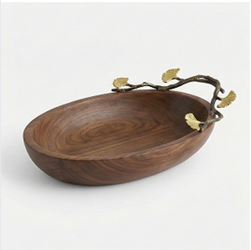Luxury handcrafted walnut wood irregular serving bowl with brass ginkgo leaf decor, perfect for elegant food presentation and table decor