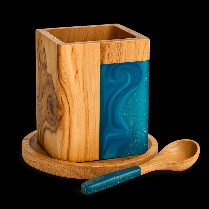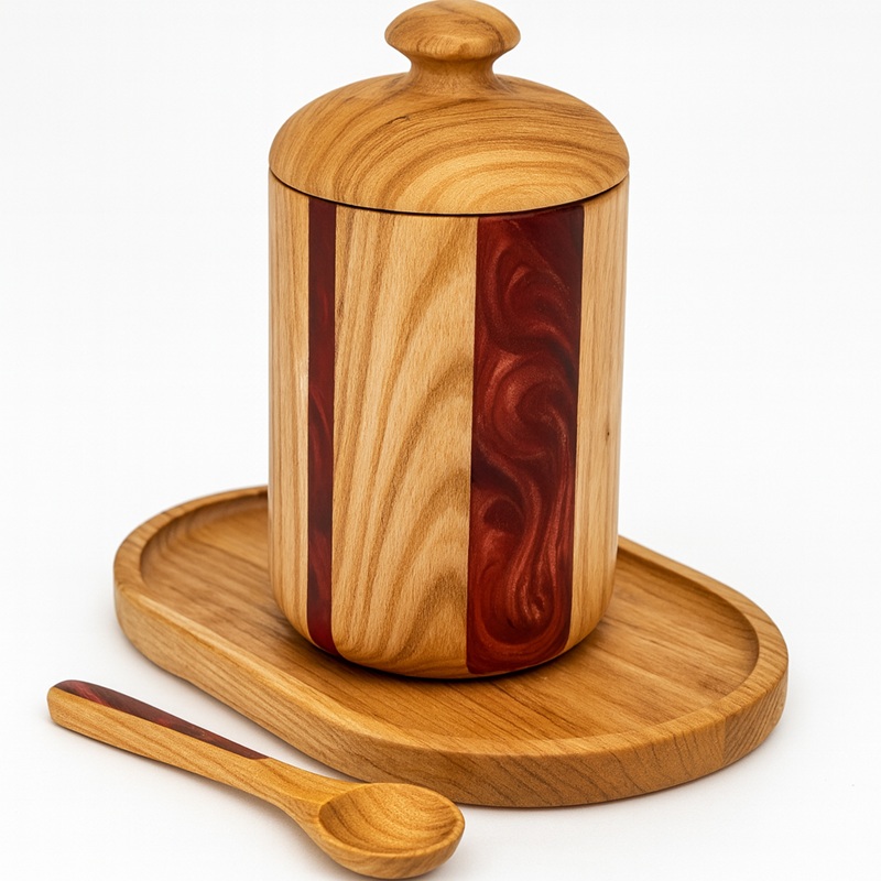 - Cohesive set: Tray & spoon mirror the jar’s wood-resin design for a unified look