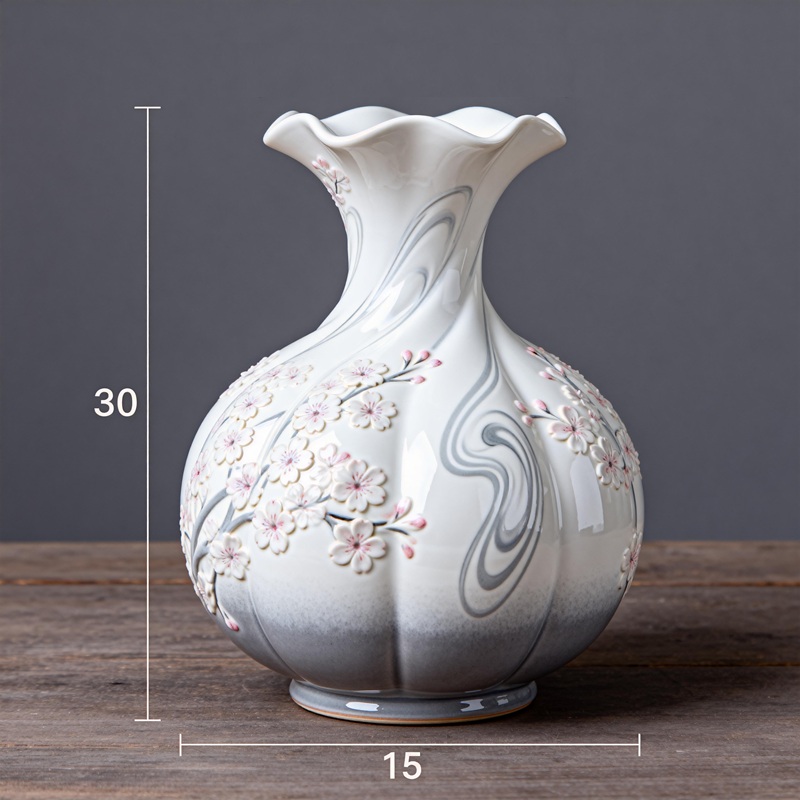 This vase features embossed sakura relief patterns and a soft gray-white gradient glaze, plus a curved wave rim. Its elegant look fits living rooms, shelves, or as a gift — it works well with flowers or as a decor.